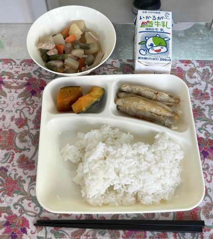 きびなごの天ぷら、含め煮、焼きかぼちゃの甘味つかけ、ご飯、牛乳です。