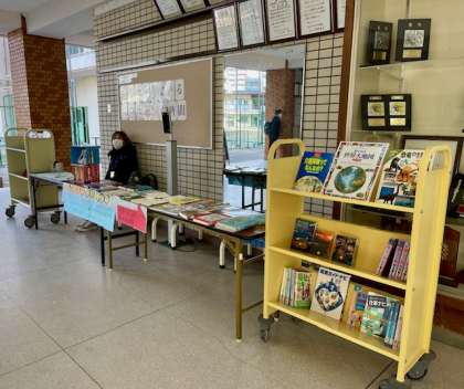玄関ホールと図書館前で保護者版図書フェスタが行われています。懇談会にお越しの際はぜひお立ち寄りください。