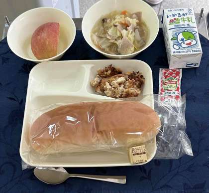 とうふローフ、カリフラワーのスープ煮、コッペパン、バター、りんご、牛乳です。