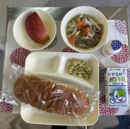 豚肉と野菜のスープ、カレーソテー、黒糖パン、りんご、発酵乳、牛乳です。