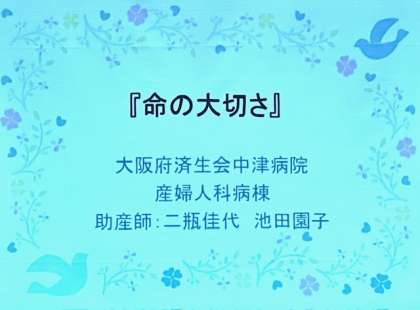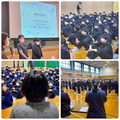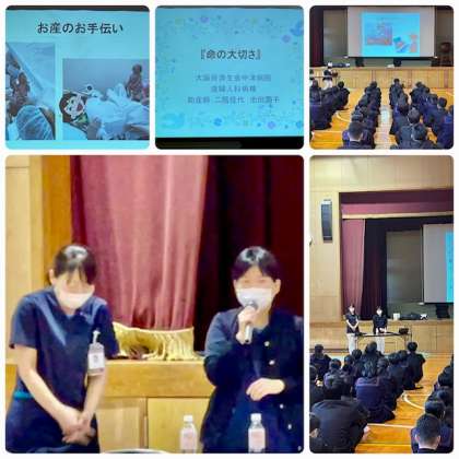 6時間目、2年生は体育館で生・性教育「命の大切さ」の学習をしました。講師は大阪府中津済生会病院より助産師の、二瓶様、池田様にお越しいただきました。