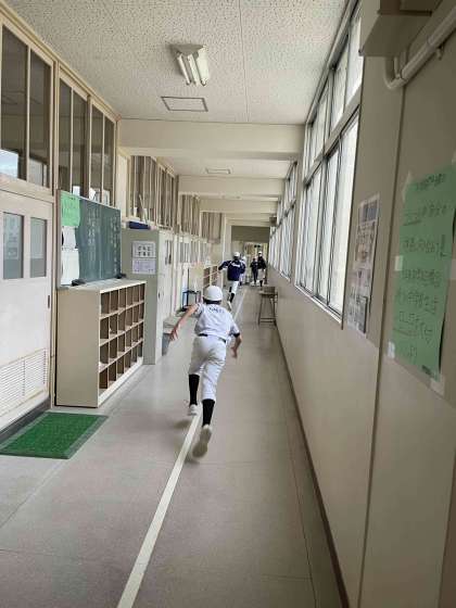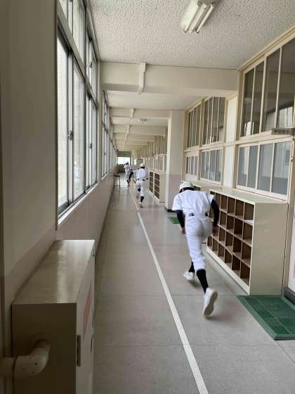 雨でグラウンドが使えないため、校舎内で練習をしています。