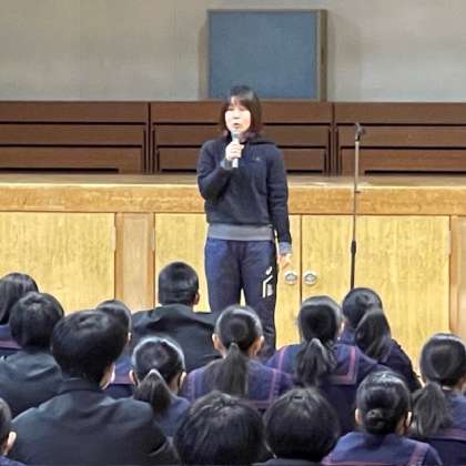 生活指導部長の福島先生からは、来年度から生徒手帳を廃止して、プラスティック製の生徒証を作りますと話されました。ついては、生徒証のデザインを募集するので参加してくださいと話されました。自分たちの生徒証を自分たちで、オリジナルの素晴らしいデザインができることを楽しみにしています。