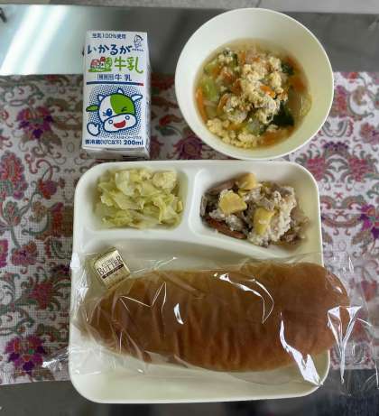 中華おこわ、卵スープ、キャベツのオイスターソースいため、コッペパン、バター、牛乳です。