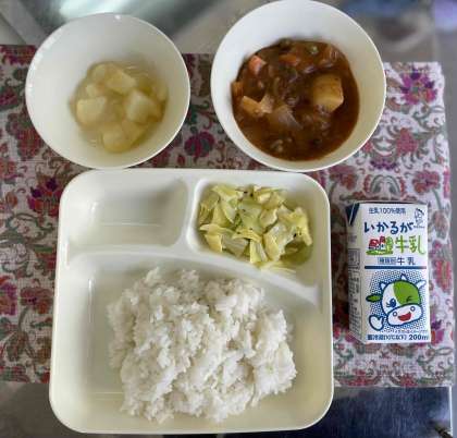 ハヤシライス、キャベツのバジル風味サラダ、洋なし(缶)、牛乳です。
