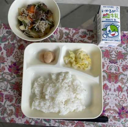 肉じゃが、はくさいのゆず風味、白花豆の煮もの、ご飯、牛乳です。