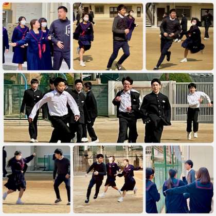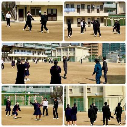 昼休みのグラウンドの様子です。今日は3年生が大阪府公立高等学校一般選抜出願で午前中に出かけました。給食が終わってグラウンドでは1・2年生が思い思いに過ごしています。バレーボールやドッジボールをしている生徒、先生を誘って鬼ごっこをしている生徒、和やかで笑顔が溢れるグラウンドです。