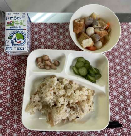 関東煮、きゅうりの梅風味、とら豆の煮もの、かやくご飯、牛乳です。