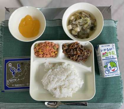 手巻きご飯(牛肉のコチジャンいため、鮭のカラフルそぼろ)、すまし汁、ダイスゼリー(みかん)、牛乳です。