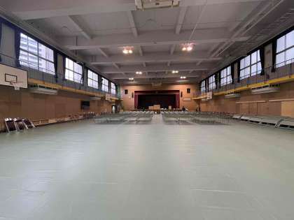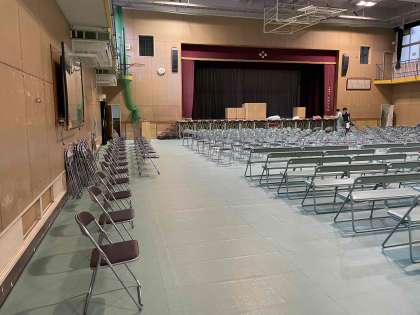 明日からの卒業式練習に向けて、本日、会場の仮設営をおこないました。