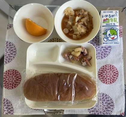 鶏肉とじゃがいものガーリック焼き、ウインナーとてぼ豆のスープ、黒糖パン、デコポン、牛乳です。