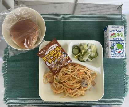 鮭のクリームスパゲッティ、キャベツときゅうりのサラダ、おさつチップス、黒糖パン(ハーフ)、牛乳です。