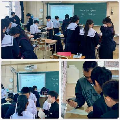 教室内で"Give me your signatuer?"と、英語で友達や先生に声をかけて、ローマ字つづりでサインを集めてまわっています。