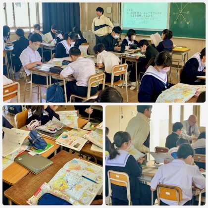 1年2組は社会の学年です。地図帳を広げて地理の学習をしています。社会も2人の先生が指導しています。