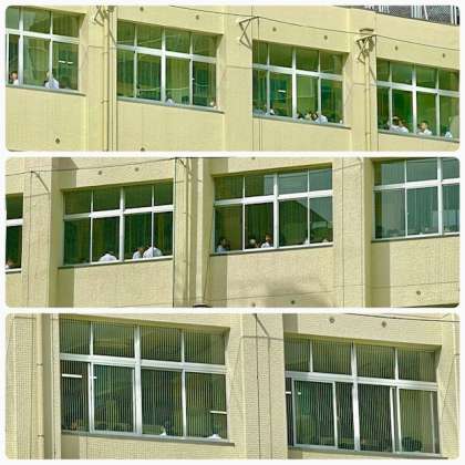 地震の避難訓練に続いて、津波についての垂直避難訓練を行いました。全ての生徒が校舎4階の教室と廊下に避難しました。避難完了は3分20秒でした。