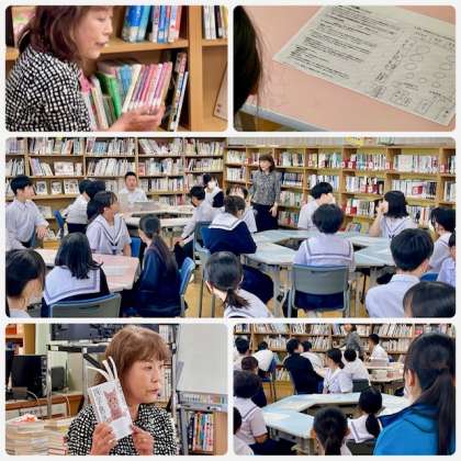 1年4組の国語の学習は、学校図書館司書の仲先生による、図書館オリエンテーションです。