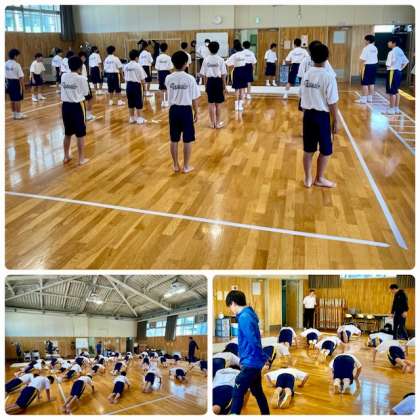 武道場では、男子が体育の学習をしています。男子も、2人の先生が教室内習熟度別授業で学習しています。