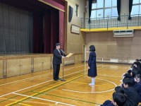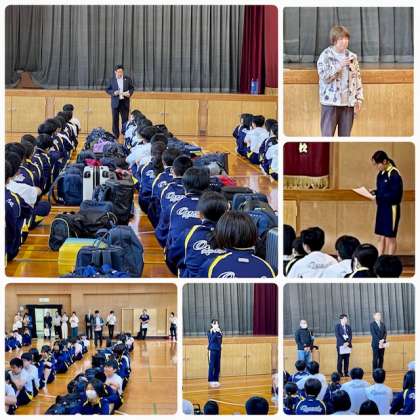 午前8時から体育館で出発式を行いました。生徒代表の戸田さんの司会で進めてくれました。校長先生からは、修学旅行の目的について生徒に問いかけ、生徒からは平和学習、集団生活、自然体験について答えていました。次に生徒代表の野中さんからのあいさつ、添乗員さん、カメラマンさんの紹介がありました。