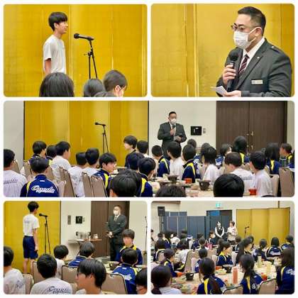18時30分になりまし。大宴会場の鳳凰で入館式です。生徒代表の笠井くんが挨拶をしてくれました。