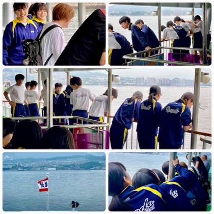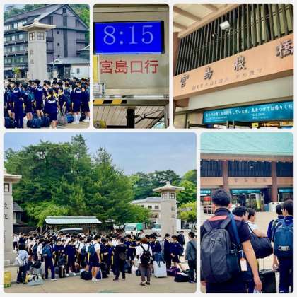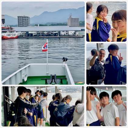 宮島桟橋から宮島口に向けてフェリーボートに乗船です。10分間の船旅ですが、名残を惜しんでいます。