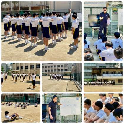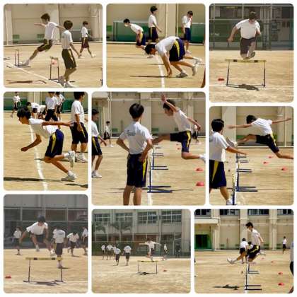 5時間目、進藤先生が3年2・3組の男子体育の公開授業を行いました。昨日までの大阪市中学校春季総合体育大会に出場した生徒は疲れが残っていた様子で、気温が上昇してしんどい中、ハードル走の学習をしました。1・2年で学んだ内容をもとにアプローチをトップスピードにする方法を身につけようと学習しました。