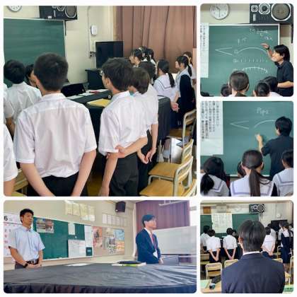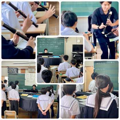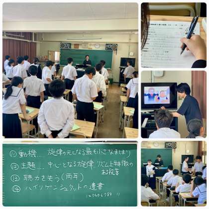 2時間目、2年4組音楽の授業で沖先生が公開授業を行いました。今日の学習は、1,動機の繰り返しに注目して反復や変化について学ぶ(交響曲第5番)2,表現のポイントに注目してアルトリコーダーのテストに備える(キセキ)3,曲にふさわしい表現をする(やさしさに包まれたなら)でした。生徒達は、音楽が大好きな様子が見て取れました。教育実習生も参観してくださいました。