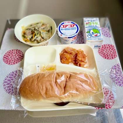 海老のチリソース、中華スープ、ヨーグルト、コッペパン、みかんジャム、牛乳です。