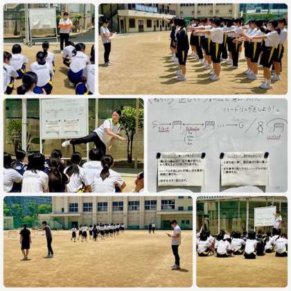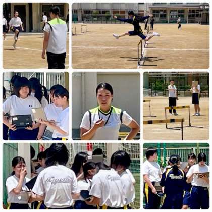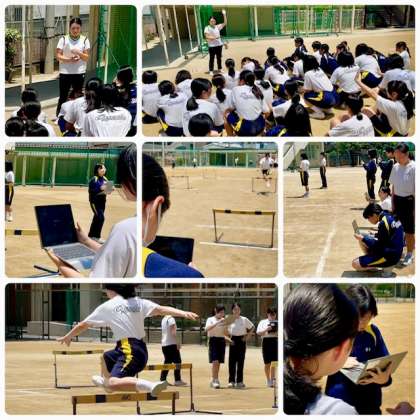 3時間目、グラウンドで3年2・3組女子体育で、杉山先生が陸上競技(ハードル走)の公開授業を行いました。