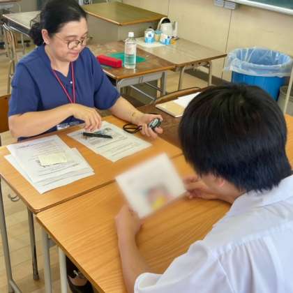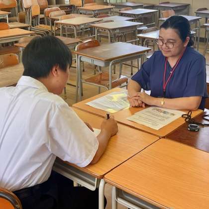 3年生の英語の授業では、C-Netのジーン先生とAll EnglishでConversationする授業を行っています。限られた時間ですが1人1人個別指導していただきます。ジーン先生の教室から出てきた生徒に聞くと「英語は楽しい」と答えてくれました。All Englishでの質問と回答も見事で発音も素晴らしかったです。