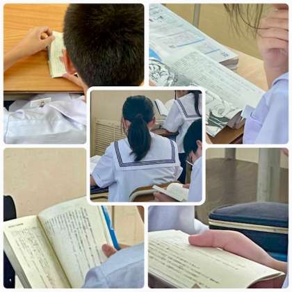 今朝の、2年生の教室の様子です。朝の学活が終わって、1時間目の授業が始まるまでの隙間時間に、夢中になって読書している生徒を見つけました。