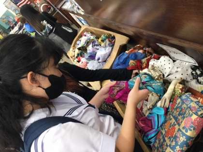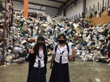 8月2日(金)の2日目の内容は、繊維業界でSDGsの課題となっている古着やデッドストックなどの分別工業を見学し、課題の取組を学び、その後、古着の中から衣装をつくる素材を選びました。古着の販売は、日本だけでなく東南アジアへ送るために、圧縮機で圧縮して輸送されるそうです。