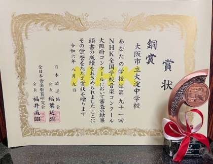 表彰状の伝達、最初は合唱部です。8月9日(金)NHK大阪ホールで開催された「全国学校音楽コンクール大阪府コンクール」で銅賞をいただきました。
