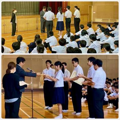 続いて、硬式テニス部の表彰です。2年生嘉戸くんが、ブロック大会で入賞しました。おめでとうございます。