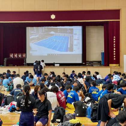 プールサイドが広くないので、体育館でリモート中継を見ながらエントリーを待ちます。心配された台風の影響もなく青空のもと大会に参加しました。8月お盆の頃に参加した、大阪市大会ではたくさんの賞状をいただきました。今日もがんばります!応援よろしくお願いします。