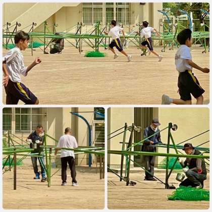 本日は、グラウンドの移動式防球ネット14台の塗装およびネットの貼り直しを行っています。