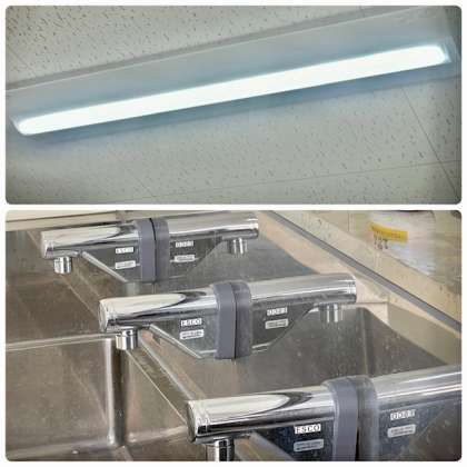 夏休み中の補修・改修工事は、全ての教室、管理室のLED化工事、手洗い場の自動水栓化工事、2年1組の扇風機新規設置、学習室1、学習室3、2つの教室のプロジェクターの黒板上部への吊下げ化を行いました。