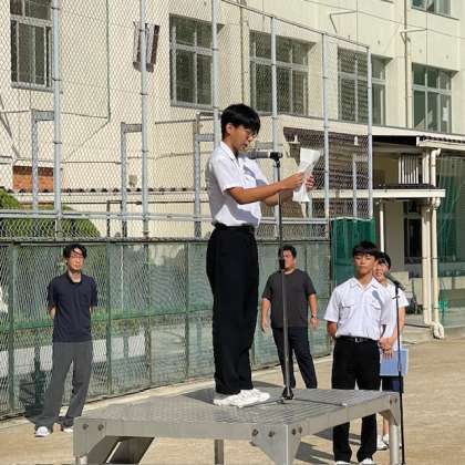 最初は、選挙管理委員長から令和6年度生徒会選挙の公示です。後期は、3年生からバトンタッチした1・2年生が立候補します。よろしくお願いします。