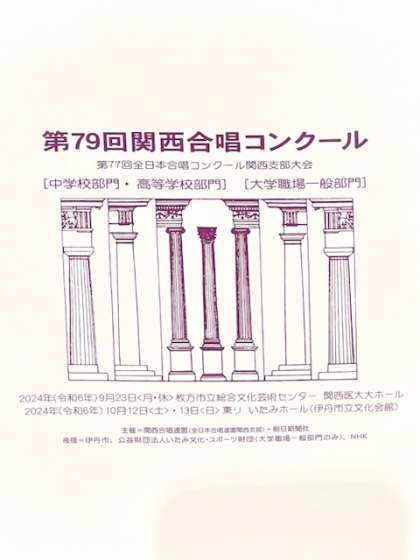 合唱部は、9月23日(月)枚方市総合文化芸術センター 関西医大大ホールで開催される第79回関西合唱コンクールに出演します。