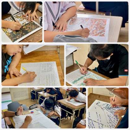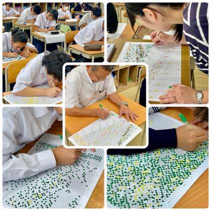 生徒は自身は、自分の分担を着色するだけでは何がデザインされているかわかりません。クラスの友だちの作品と繋ぎ合わせてはじめて、何が描かれているかわかります。