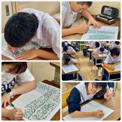 用紙は夏休み中に4組担任の荒尾先生が用意してくださいました。集中して着色する根気のいる作業です。