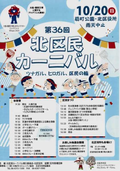 10月20日(日)北区扇町公園一帯で「第36回北区民カーニバル」が開催されました。昨日の雨で開催が心配されましたが朝から秋晴れの絶好の日和となりました。