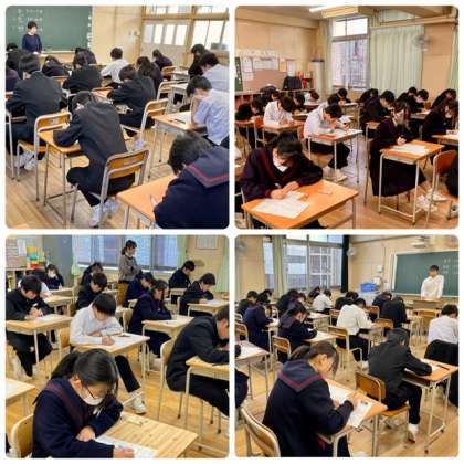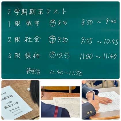 今日から金曜日まで、2学期末テストが行われています。1・2年生初日の今日は、1時間目 数学、2時間目 社会、3時間目 保健体育のテストです。