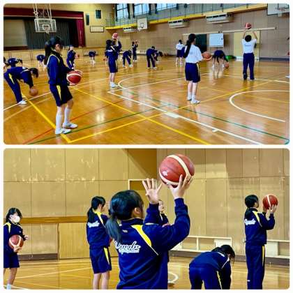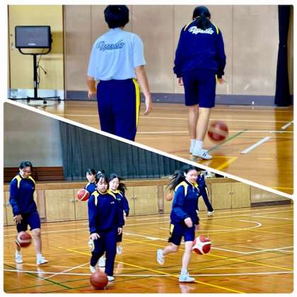 2年3・4組女子は体育館でバスケットボールの学習です。大淀中学校にはバスケットボール部はありませんが、とても器用にボールを扱っています。