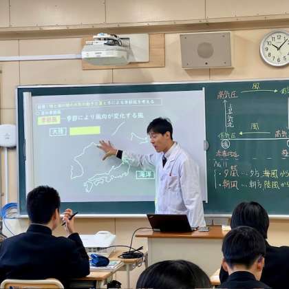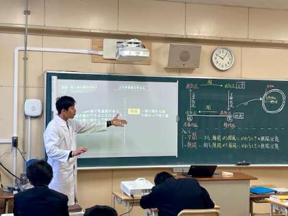 2年4組の理科、気象の学習です。高原先生は二学期より週3日間、校区の中津小学校、大淀小学校で専科教員として理科の授業を担当しています。今日は大淀中学校の授業日です。
