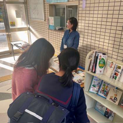 1・2年生も今日から二学期末懇談会が始まりました。元気アップコーディネーターさんが、今日も「図書館フェスタ」の受付をしてくださっています。ありがとうございました。