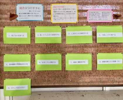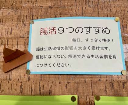 保健室前の掲示板に「腸活9つのすすめ」の掲示物があります。9つのテーマをめくってみると、有効なアドバイスが示されています。