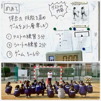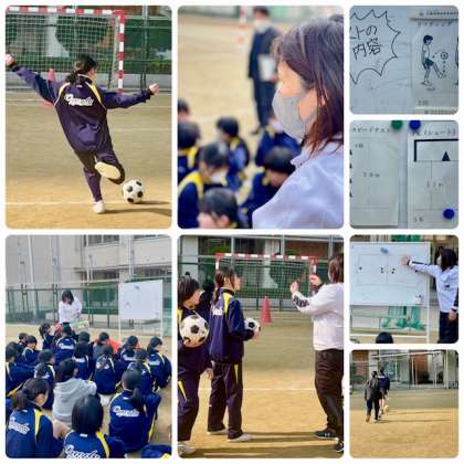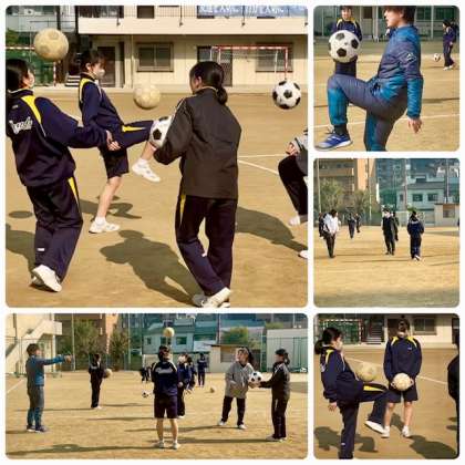 指導法を工夫して、サッカーの学習はとても楽しそうでした。リフティングの練習コーナーでは、滝本先生がティームティーチングでコツを教えてくださいました。2時間後にはサッカー実技テストが予定されています。