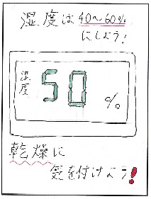 「寒くても まどを開けて かんきしましょう!」「湿度は40〜60%にしよう!」「ストーブとの距離には気をつけよう」