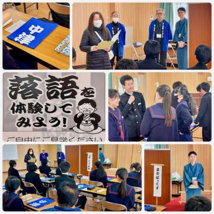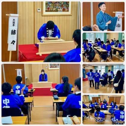 2年生は1年生の時に、天満天神繁昌亭で古典落語を鑑賞しました。今回は、創作落語を実際に体験することができました。中津と染め抜きされた法被に袖を通し、気分も盛り上がり、代表生徒が高座に上がって落語を披露させていただきました。