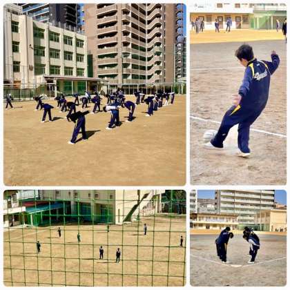 1年生体育の授業の様子です。男子はグラウンドでキックベースボール、女子は体つくり運動の学習をしていました。楽しそうです。